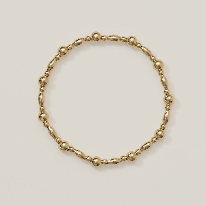 Our Reese bracelet is warm, elegant + endlessly stackable. Gold-filled oval-shaped beads with multi-sized beads throughout give Reese a dimensional look that fits perfectly into any stack.  All bijoux beaded bracelets are hand-strung on a stretch cord with an invisible closure.